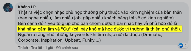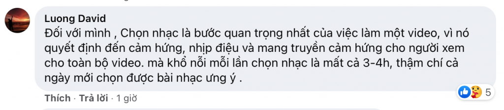 Bạn thấy đấy, theo mình thì nhạc không phải là thứ quan trọng nhất. Nhưng nó là thứ có sức mạnh to lớn trong việc mang lại cảm xúc cho khán giả. Rất nhiều người tốn đến vài giờ đồng hồ, thậm chí cả ngày chỉ để tìm nhạc.