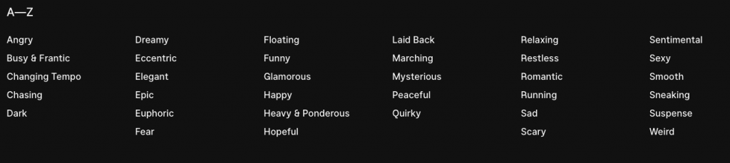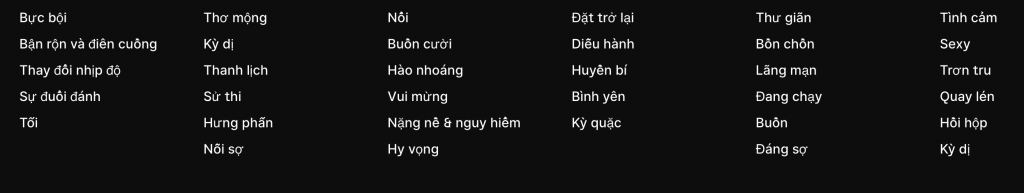 Bạn thấy có dễ không ? Nhưng trong thực tế thì đôi khi chẳng có từ khoá nào cả. Thì bạn nên duyệt tìm nhạc theo danh mục tiếp theo đó là cảm xúc. Bạn sẽ duyệt tìm theo cảm xúc mong muốn là 1 trong 34 loại cảm xúc dưới đây.