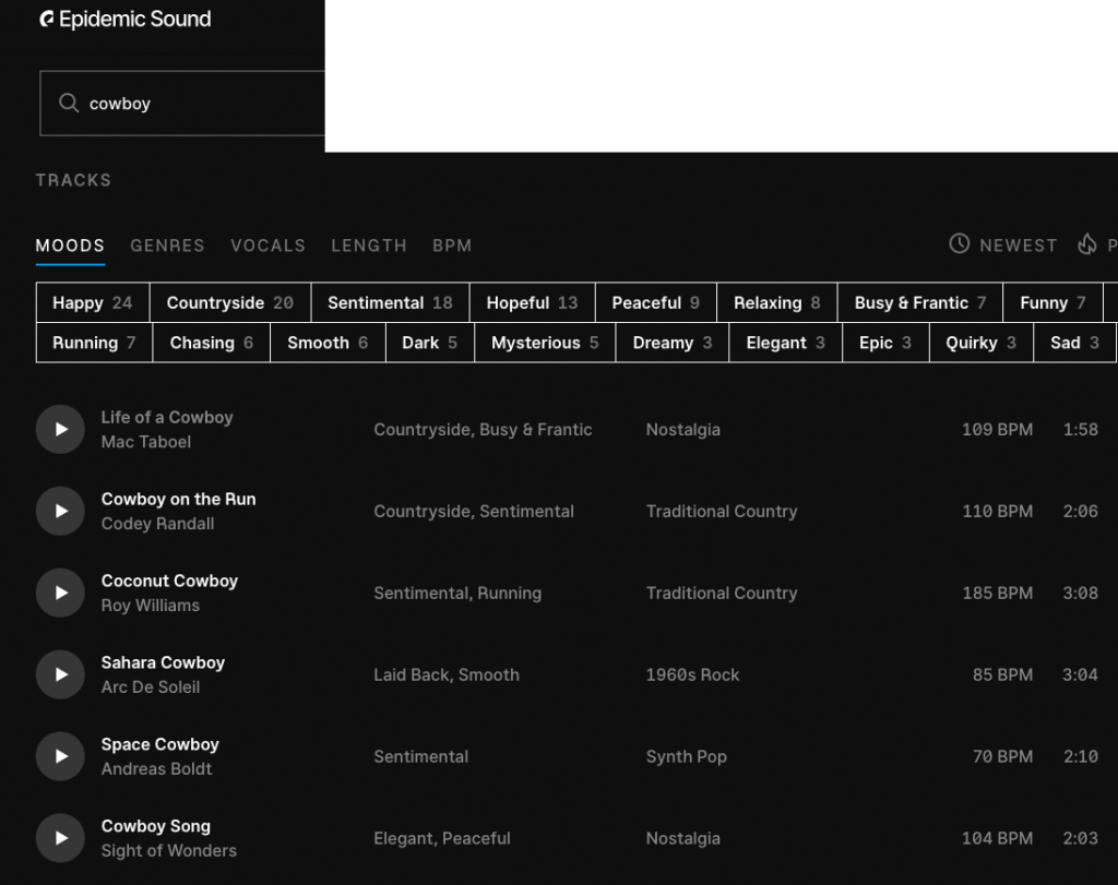 Nếu bạn đang muốn làm video theo phong cách cao bồi mỹ thì cứ mạnh dạn gõ vào từ khoá “cowboy”. Những kết quả liên quan đến cao bồi sẽ hiện ra và bạn có thể lọc theo 34 loại cảm xúc. Đầy đủ từ “sad (buồn) – happy (hạnh phúc) – funny (hài hước) cho đến các cảm xúc dark (đen tối) – fear (sợ hãi)”.