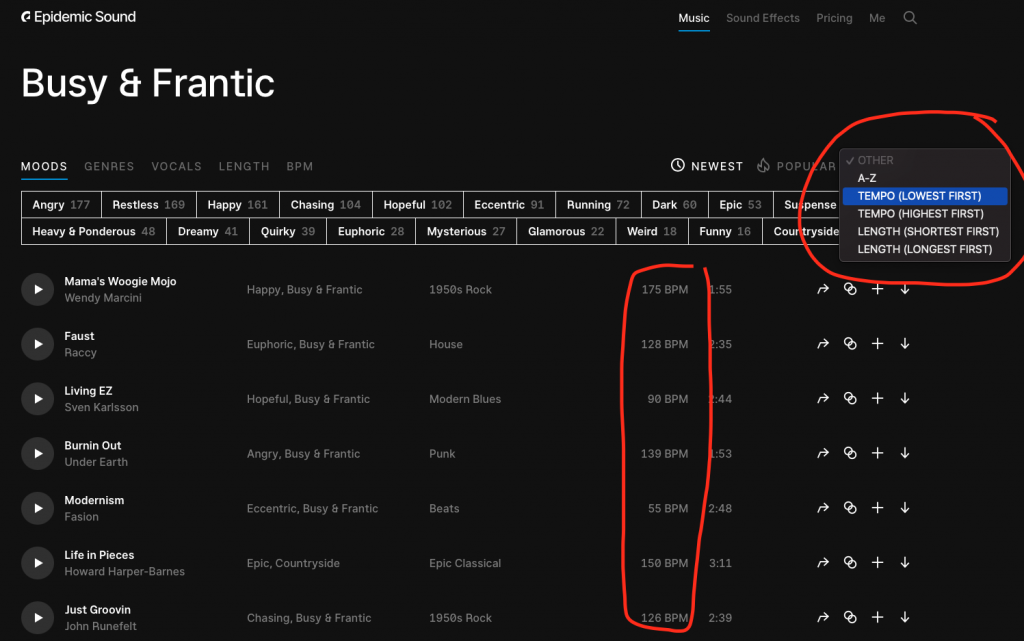Riêng Tempo thì chỉ có một số kho nhạc xịn mới có hỗ trợ lọc tìm. Như kho EpidemicSound là xịn nhất vì có thể xem được BPM của từng bài và sắp xếp từ chậm đến nhanh hoặc ngược lại. Còn Artlist.io thì chỉ xếp chung chung 3 mức <nhanh – vừa – chậm>. Youtube thì ko có xem được tempo luôn, lúc đó bạn cần có 1 cái tai xịn.