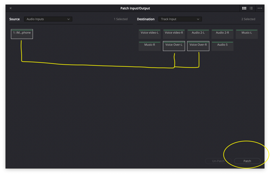 Ở cửa sổ Patch Input/Output : click chọn micro muốn thu ở phía bên trái và bấm Patch để nối micro với lớp audio muốn ghi vào.